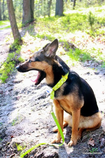 Janka szybko „wyrosła” ze swoich pierwszych szorek, dlatego szukałam czegoś solidnego, co mogłoby nam służyć również w samochodzie. Ponieważ Janka na tym etapie naszego wspólnego życia ciągle panikowała, kiedy zakładałam jej obrożę – wybór był prosty.